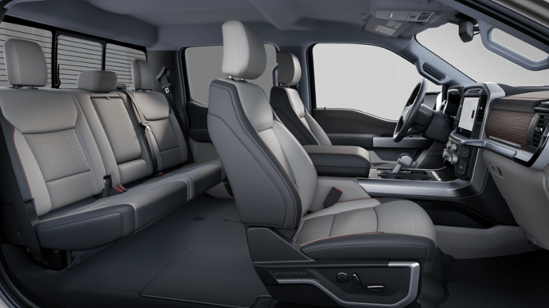 This F-150 Lariat is nicely equipped with Equipment Group 501A Mid (6 Angular Bright Anodized Step Bar, Illuminated Driver & Passenger Visors, Power-Sliding Rear Window, and Wheels: 20 Chrome-Like PVD), 4WD, 4-Wheel Disc Brakes, 8 Speakers, ABS brakes, ActiveX Trimmed Bucket Seats, Adjustable pedals, Air Conditioning, Alloy wheels, AM/FM radio: SiriusXM with 360L, Auto High-beam Headlights, Auto-dimming door mirrors, Auto-dimming Rear-View mirror, Automatic temperature control, Brake assist, Bumpers: chrome, Chrome wheels, Compass, Delay-off headlights, Driver door bin, Driver vanity mirror, Dual front impact airbags, Dual front side impact airbags, Electronic Stability Control, Emergency communication system: SYNC 4 911 Assist, Front anti-roll bar, Front Bucket Seats, Front Center Armrest, Front dual zone A/C, Front fog lights, Front reading lights, Front wheel independent suspension, Fully automatic headlights, Garage door transmitter, Heated door mirrors, Heated front seats, Heated steering wheel, Illuminated entry, Internet access capable: FordPass Connect 5G, Low tire pressure warning, Memory seat, Navigation system: Connected Navigation, Occupant sensing airbag, Outside temperature display, Overhead airbag, Overhead console, Panic alarm, Passenger door bin, Passenger vanity mirror, Pedal memory, Power door mirrors, Power driver seat, Power passenger seat, Power steering, Power windows, Radio data system, Radio: B&O Sound System by Bang & Olufsen, Rain sensing wipers, Rear reading lights, Rear seat center armrest, Rear step bumper, Rear window defroster, Remote keyless entry, Security system, Speed control, Split folding rear seat, Steering wheel mounted audio controls, SYNC 4 w/Enhanced Voice Recognition, Tachometer, Telescoping steering wheel, Tilt steering wheel, Traction control, Trip computer, Turn signal indicator mirrors, Variably intermittent wipers, Ventilated front seats, Voltmeter, and Wheels: 18 Chrome-Like PVD.