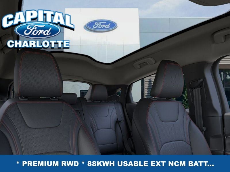 Star White Metallic Tri-Coat 2025 Ford Mustang Mach-E Premium Dual Electric Motor RWD **360 CAMERA**, ** FORD CO-PILOT360 ACTIVE 2.0**, **BLUECRUISE**, **DUAL ZONE TEMP CONTROL**, **HEATED & COOLED LEATHER SEATS**, **HEATED STEERING WHEEL**, **DUAL POWER SEATS**, **POWER LIFTGATE**, **BANG & OLUFSEN SOUND SYSTEM**, **SYNC4**, **SIRIUS XM SATELLITE RADIO**, **BACKUP CAMERA**, ** UP TO 150KW DC CHARGE CAPABLE **, ** J1772 CCS COMBO CONNECTOR **, ** 11KW AC ONBOARD CHARGER **, ** ONE PEDAL DRIVE **, ** 88KWH USABLE EXT NCM BATTERY **, ** FIXED PANO ROOF **, 10 Speakers, 1st & 2nd Row Floor Liners w/o Carpet Mats, AM/FM radio: SiriusXM with 360L, Apple CarPlay/Android Auto, Auto High-beam Headlights, Brembo Branded Front Brakes, Cargo Area Cover, Cargo Floor Liner, Delay-off headlights, Emergency communication system: 911 Assist, Equipment Group 300A Standard Package, Fully automatic headlights, Interior Protection Package, Low Tire Pressure Warning, Memory seat, Mobile Power Cord (120V/240V), Navigation system: Connected Navigation, Radio: B&O Sound System by Bang & Olufsen, Rain sensing wipers, Rear Window Wiper, Red Painted Front & Rear Brake Calipers, SiriusXM w/360L, Speed-Sensitive Wipers, Sport Appearance Package, Sport Pedals, SYNC 4A w/Enhanced Voice Recognition, Telescoping Steering Wheel, Tilt Steering Wheel, Unique Front Fascia, Variably intermittent wipers, Wheels: 19 Monochromatic High Gloss Black-Painted. 115/104 City/Highway MPG Price includes: $2000 - EV Public Charging Credit(FPP Alt.). Exp. 03/31/2026 $4000 - Retail Customer Cash. Exp. 03/31/2026 $1,000 - Trade Assist. Exp. 03/31/2026 Will be applied to the trade allowance of a customers Car,Truck,Van or SUV. Must be a 2012 or new model with less than 100,000 miles. Eligible trade in vehicles must legally pass a North Carolina vehicle inspection and be appraised at Capital Ford Charlotte by a manager. Any and all necessary reconditioning required to resell the vehicle will be deducted from the appraisal. This offer cannot be used with Kelly Blue Book Trade in Market Place.